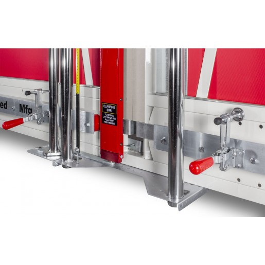 - Jeu de pinces de serrage inférieures gauche et droite pour le serrage d’un ou de plusieurs panneaux pendant la découpe ou le sciage